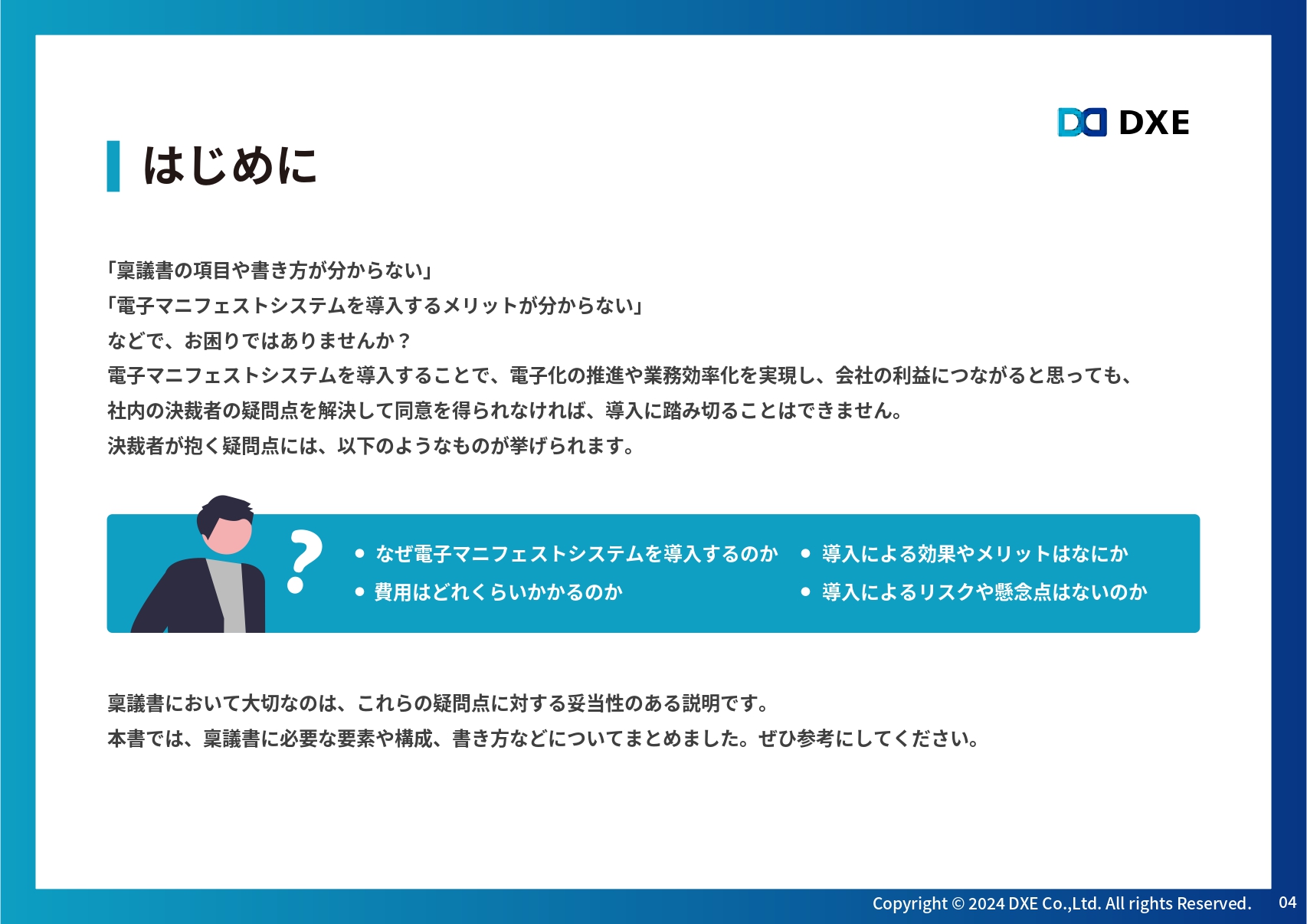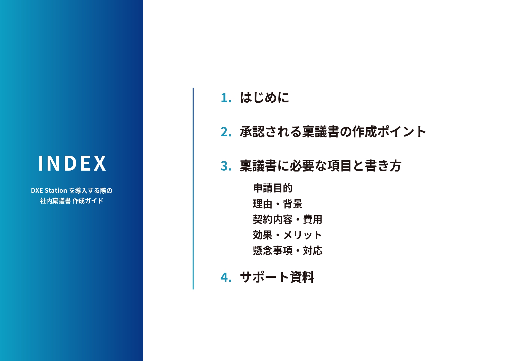 DXE Stationを導入する際の社内稟議書の書き方をまとめた資料です。稟議書のサンプルも付いています。